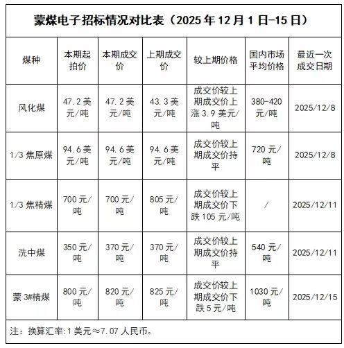 2025年12月1日至15日,煤炭企业参加电子竞拍场次31场,竞拍数量153.6万吨,其中成交19场,流拍12场,成交数量64万吨,成交量占竞拍总量41.67%。